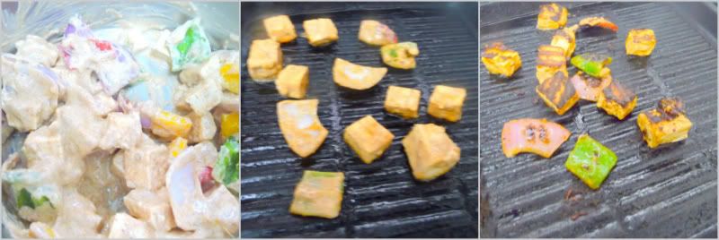 Grill the veggies and tofu on a grill pan using a little oil. Keep the grilled product aside for later use.
