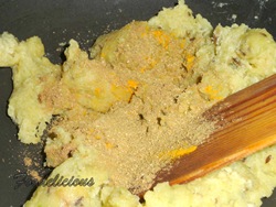 Stir continuously and add all the spices, mix thoroughly. Once the mixture starts thickening and starts leaving the edges and forms like a ball, switch off the flame.