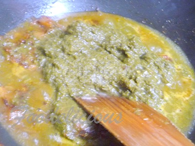 Once the potatoes are done, mix the mustard greens paste. Add half a cup of water and some garam masala (optional).
