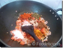 Tip in all spices and salt to taste, mix thoroughly. Cook till tomatoes are mushy and oil separates.